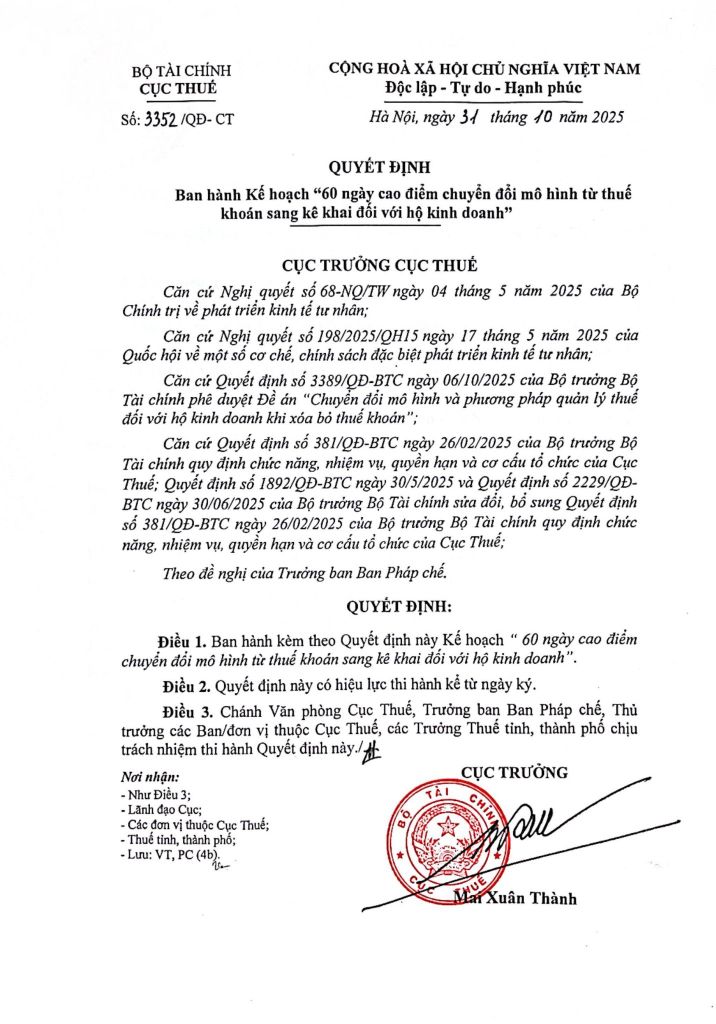 Ngày 31/10/2025, Cục Thuế (Bộ Tài chính) đã ban hành Quyết định số 3352/QĐ-CT, phát động Kế hoạch “60 ngày cao điểm chuyển đổi mô hình từ thuế khoán sang kê khai đối với hộ kinh doanh”, triển khai trên phạm vi toàn quốc từ ngày 1/11 đến 30/12/2025. Đây là một trong những kế hoạch trọng điểm của ngành Thuế nhằm hiện đại hóa công tác quản lý thuế, thúc đẩy minh bạch và chuyển đổi số trong khu vực kinh tế tư nhân.