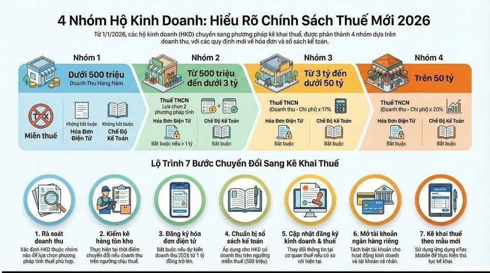 Bước 1: Rà soát doanh thu, xác định nhóm theo 2 mốc quan trọng là doanh thu 500 triệu đồng và 3 tỉ đồng một năm. Từ 2026, nếu doanh thu dưới 500 triệu đồng, không phải kê khai, không phải nộp thuế. Từ 500 triệu đồng - dưới 3 tỉ đồng, nộp theo tỷ lệ trên doanh thu hoặc nộp trên thu nhập chịu thuế (doanh thu trừ chi phí). Trên 3 tỉ đồng, tính thuế theo thu nhập chịu thuế.